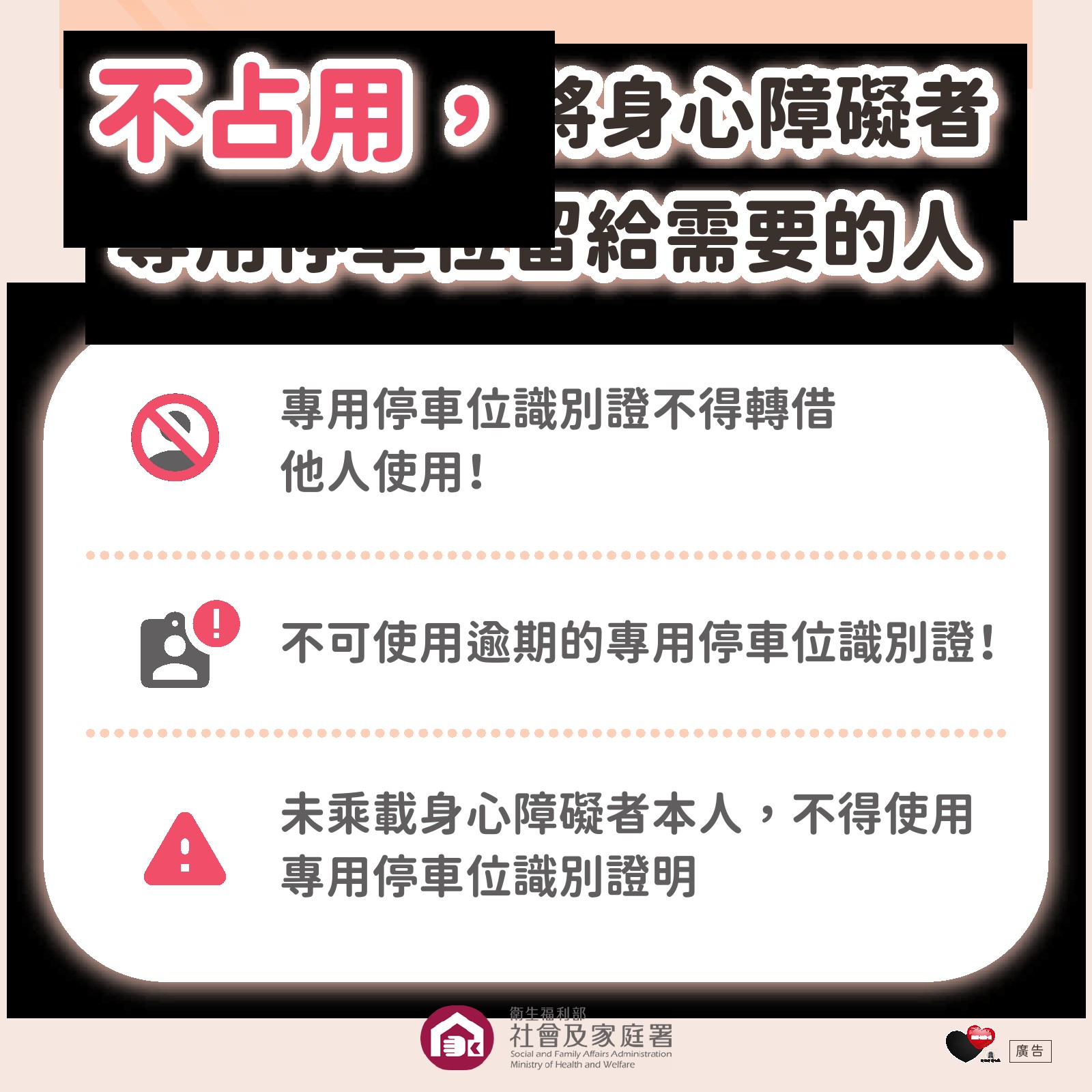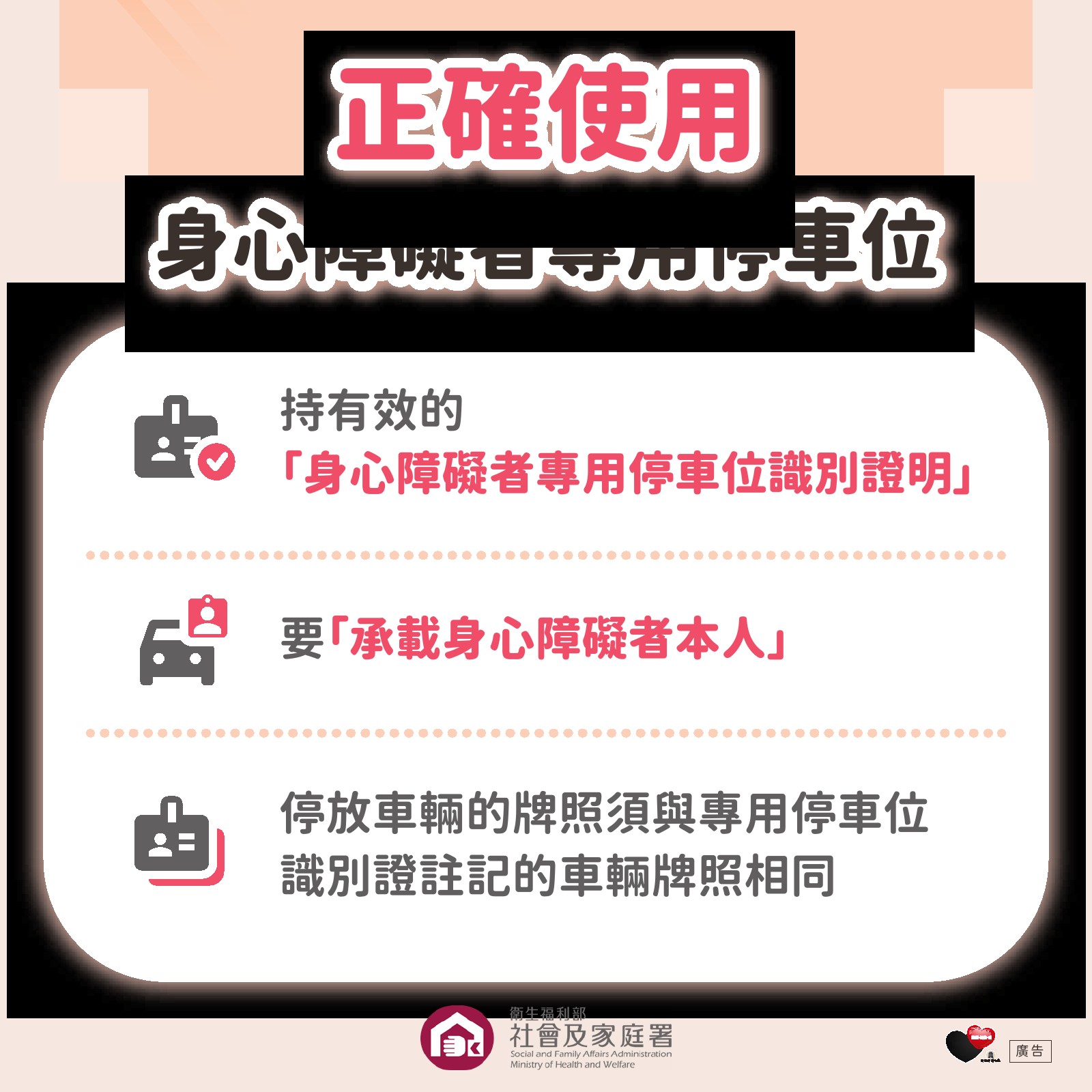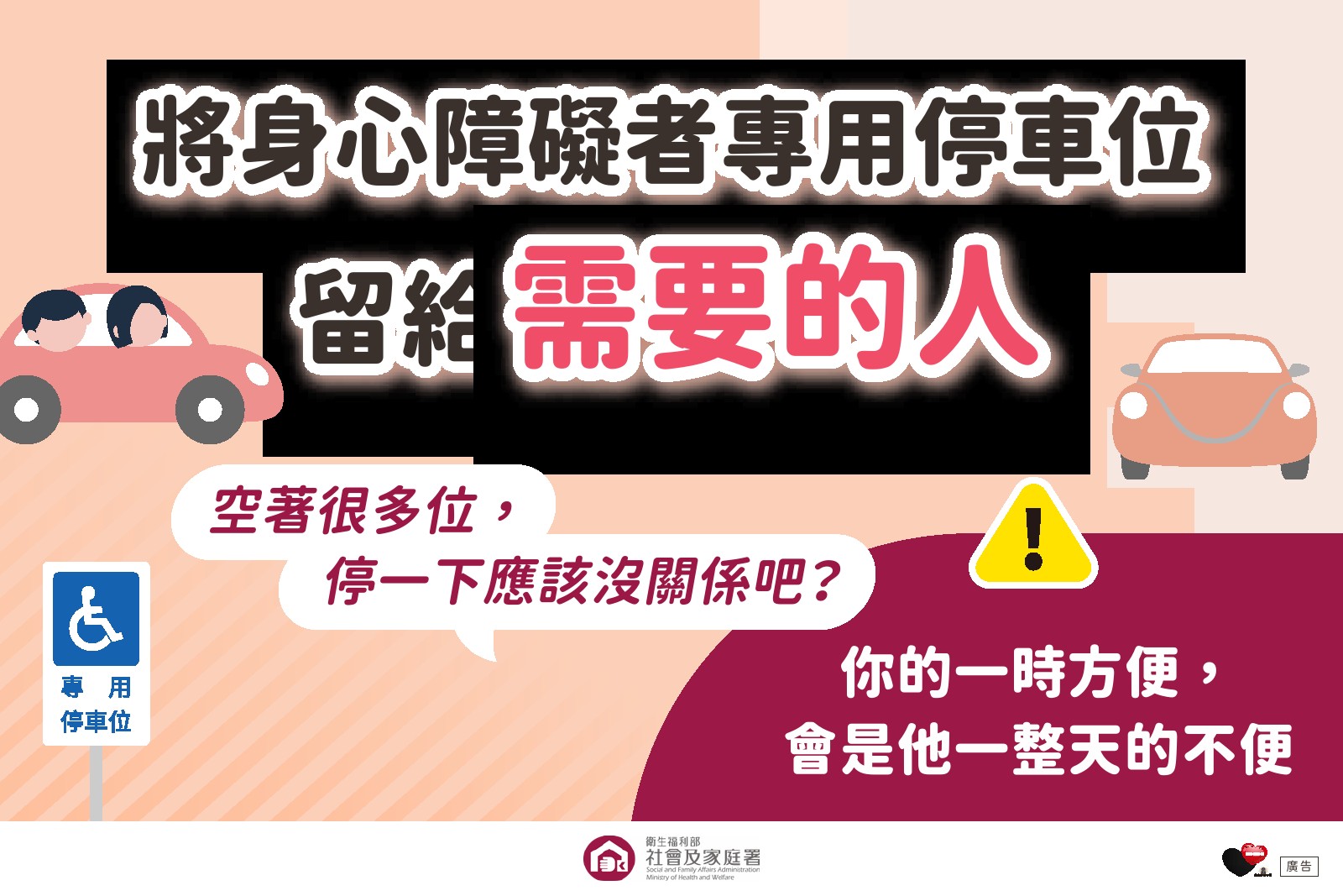 桃園市立中興國民中學(2025)。【平面】衛生福利部社會及家庭署為加強宣導民眾正確使用身心障礙者專用停車位,製作宣導宣導圖卡。上網日期: 2025年10月18日。檢自:https://pse.is/8au29k。〔點圖連結原文網站〕